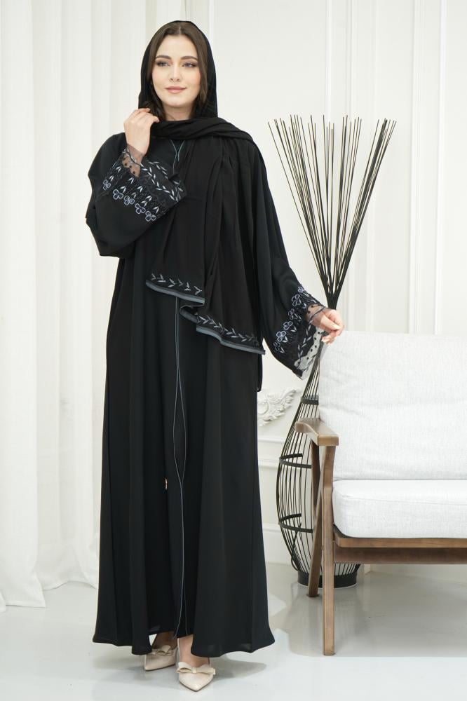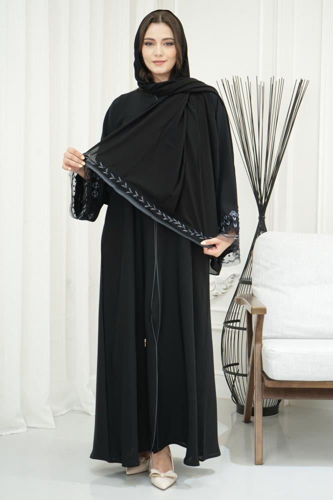 الطرحه حرير ليزار بطرف تطريز يدوي على تصميم العباية