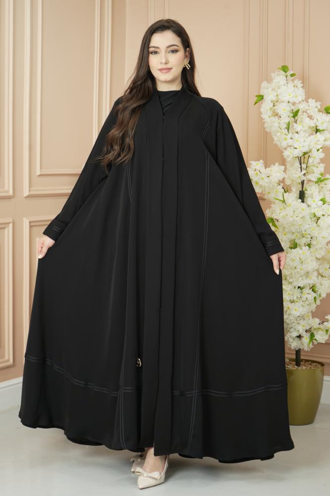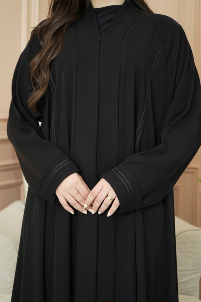 يزين العباية خطين قيطان ممتدين بشكل راقي يبرز جمال القصة ويعطيها حضور فخم وهادئ في نفس الوقت.