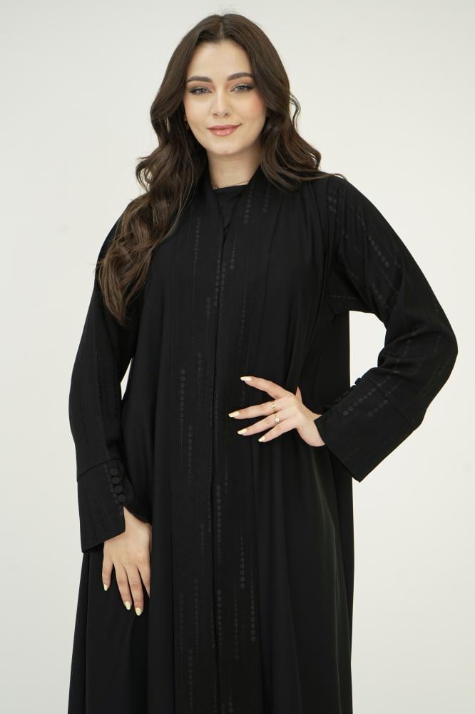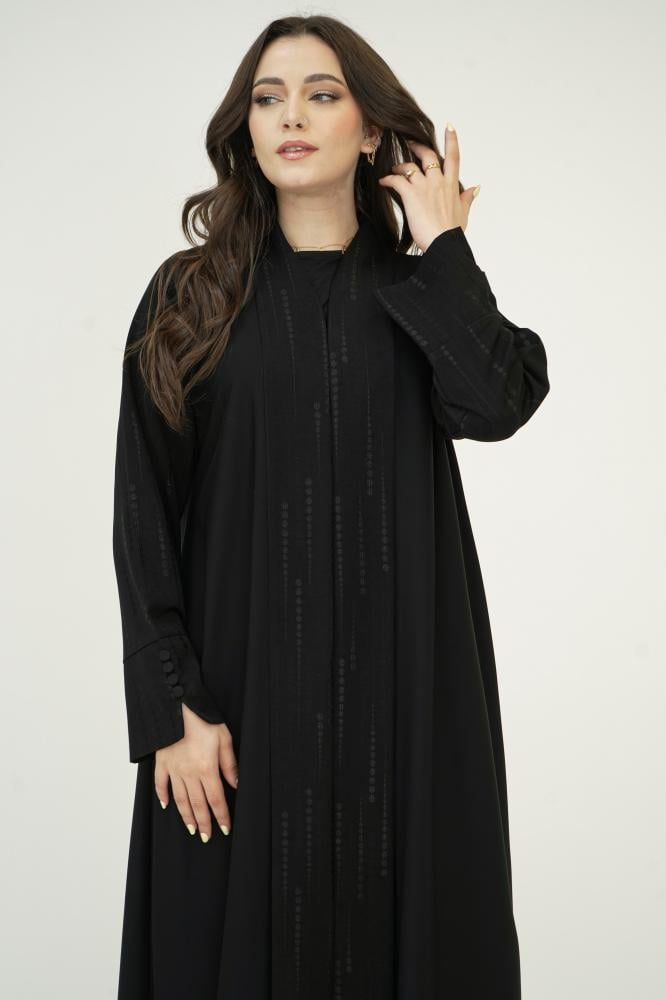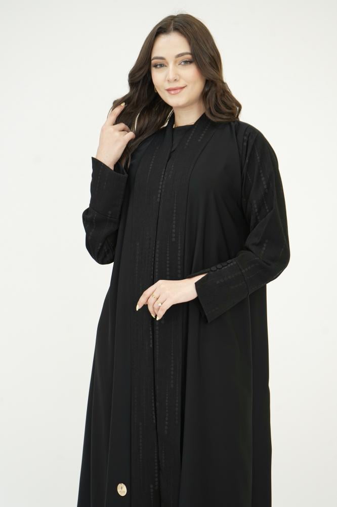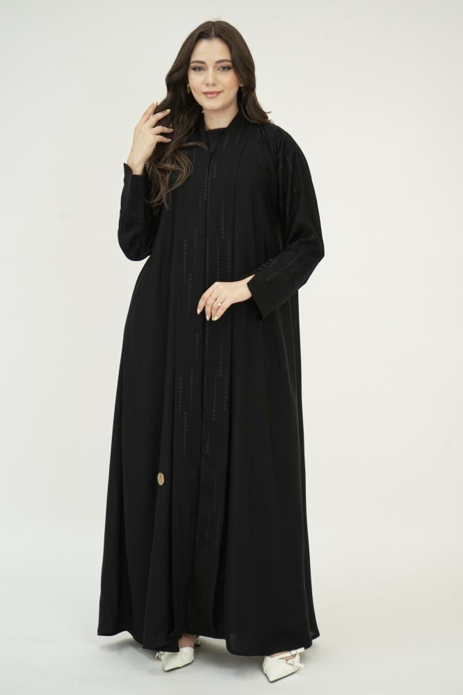 تصميم فخم من قماش حرير نواعم الناعم والراقي، مزودة بـ قلاب من قماش كتان منقط يضيف للعباية حركة أنيقة ولمسة مختلفة تشد النظر.
