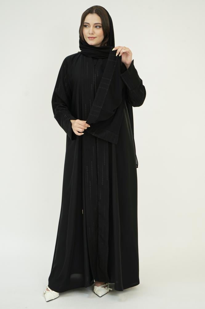✨ ويكتمل جمال العباية مع طرحة حرير كوري بحافة من كتان منقط بنفس تفاصيل العباية، تعطي تناسق راقي وطلة متكاملة من أول نظرة.