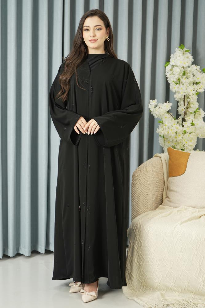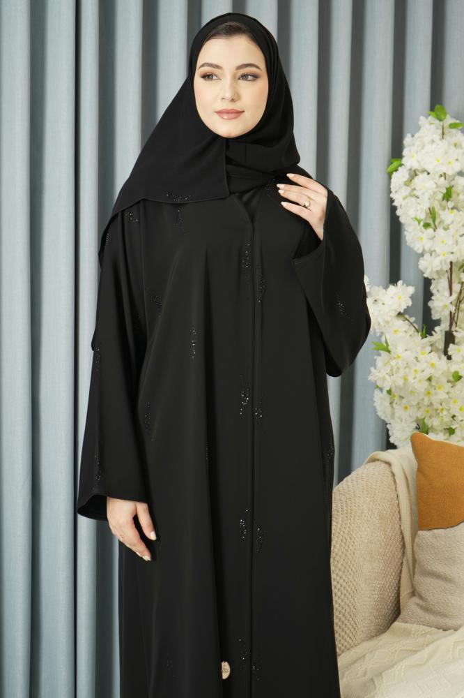 مكملة بـ طرحة حرير ليزر كوري بحافة نواعم وتطريز بشكل هلال ينسجم مع تفاصيل العباية ويكمل جمال الطلة.