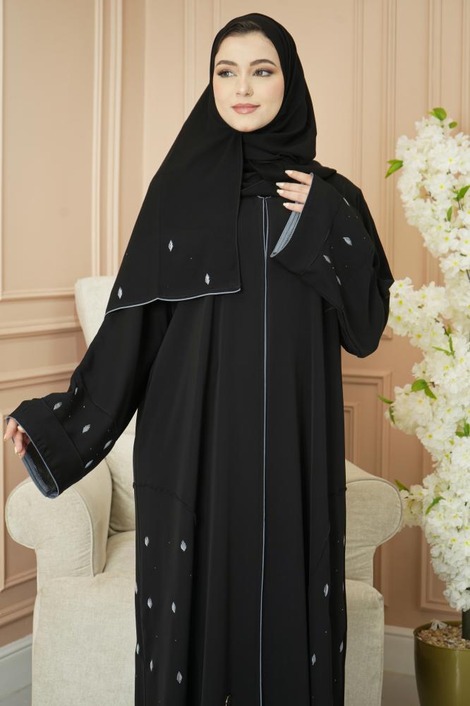 عباية حرير فاخرة بتصميم كلوش، مطرزة بخيوط ناعمة على الجوانب وأطراف الأكمام، تعطي لمسة أنثوية راقية. مرفقة بطرحة حرير بنفس النعومة، مطرزة بحرفنة على الحواف لتكمل الطقم بشكل متناسق وأنيق. قطعة تجمع بين الرقة والفخامة، وتليق بالمناسبات الراقية وأمسيات السهر
