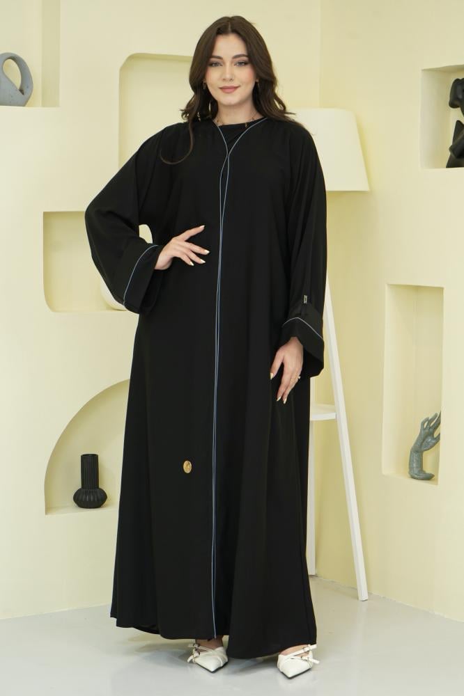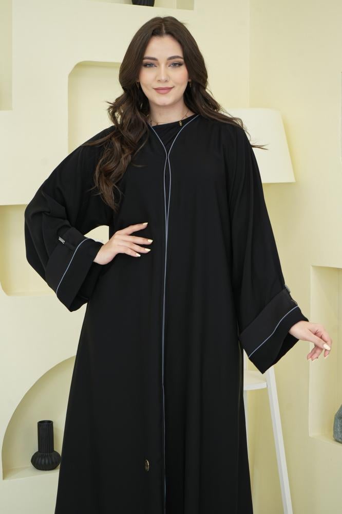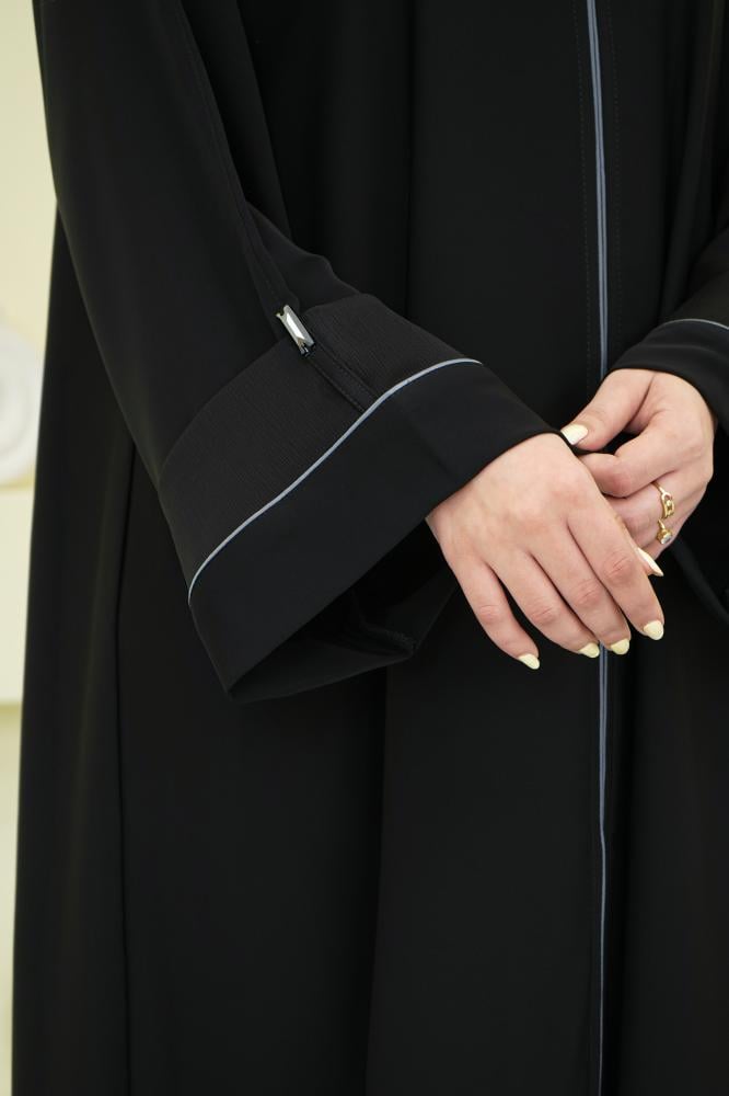 عباية أنيقة مصممة من قماش نواعم الناعم والفاخر، بأكمام مربعة مزينة بخط رصاصي أنيق على الحافة، مع لمسة جميلة على الكم من قماش تيك توك تضيف لمسة عصرية ناعمة.